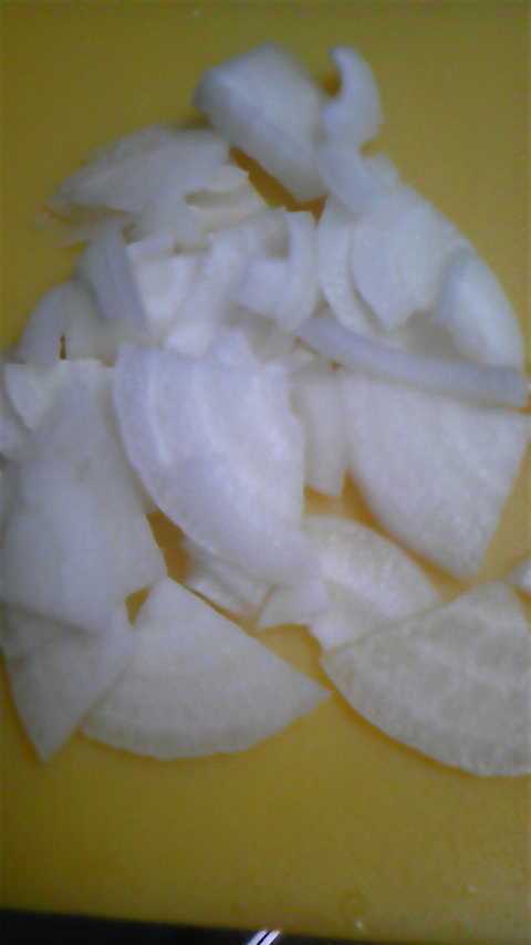 ② 下ごしらえ・・・玉ねぎを 薄くスライス! ロースは 適当な大きさに カット!(僕は、そのまま!)