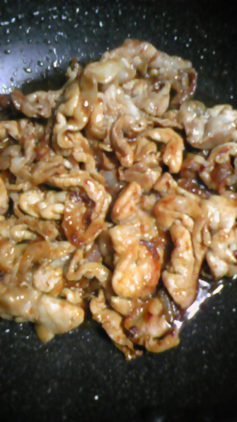 ⑤ さらに炒めて 玉ねぎが しんなり して、ロースが焼けてきた!
