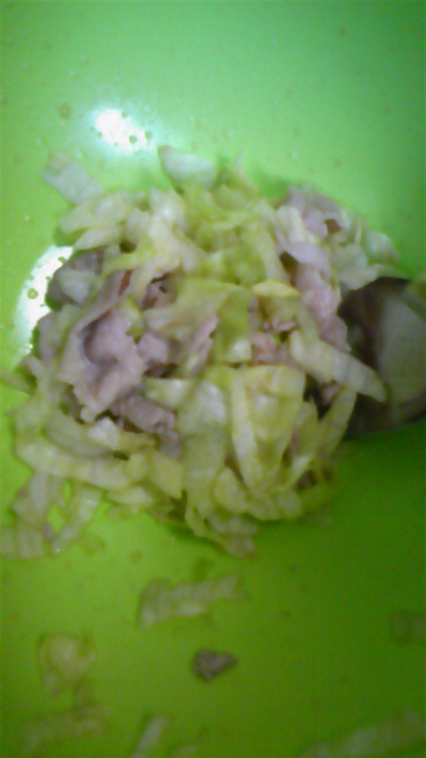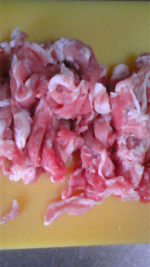 ① とにかく 早く 仕上げたいので、レタス・豚肉を 細く切る。